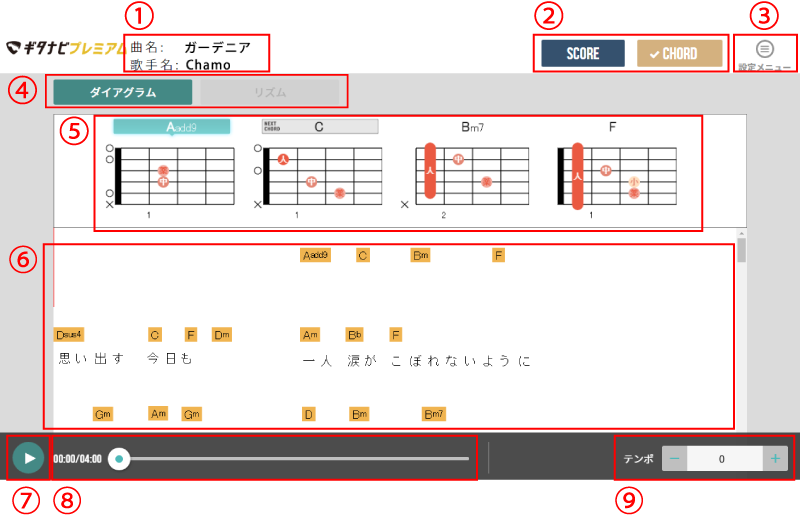 ⑤ 現在弾いている部分から3つ先までのコードダイアグラムを表示します