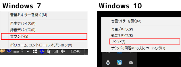 ① PCのタスクバーに表示されているスピーカーアイコンを右クリックし、「サウンド」メニューをクリックします