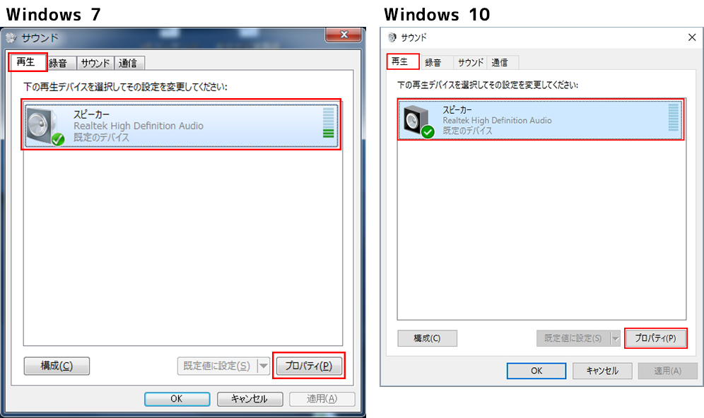 ② 表示されたウィンドウから「再生」タブをクリックし、「スピーカー」を選択して「プロパティ」ボタンをクリックします