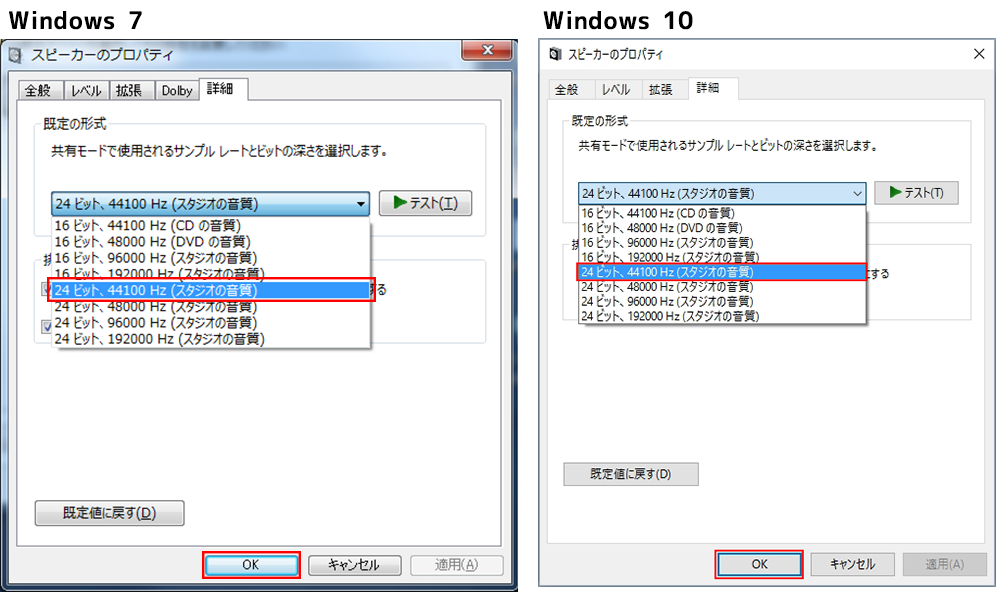 ④ 「既定の形式」が「44100 Hz」になっているのを確認します