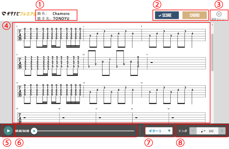 ⑦ 譜面の表示パートを選択できます(ギター1/ギター2/ギター3/ベース)