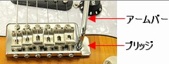 ストラトタイプのブリッジは写真の様にアームバーが付いている事が多く、このアームバーを上下に動かすことによって劇的な音程の変化を生む。