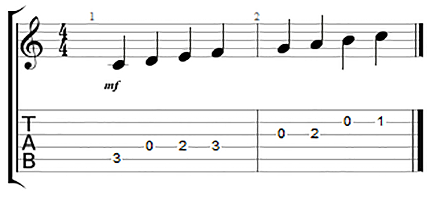 ここでは、開放弦を使ったもっとも簡単なCメジャースケールと、人差指・中指・薬指・小指を基礎的な動きでまんべんなく使う7-10フレットで弾くCメジャースケールにチャレンジしてみましょう。