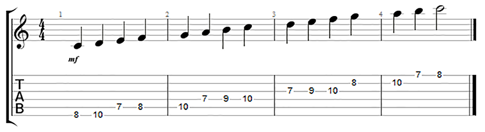 このポジションでは、ドレミファソラシドが2オクターブに渡って弾くことができるので、6弦8フレットのドから始めて1弦8フレットのドまで一気に弾いてみたり、先程の開放弦を使ったポジションと同様に、ドシラソファミレドと往復してみると良いでしょう。