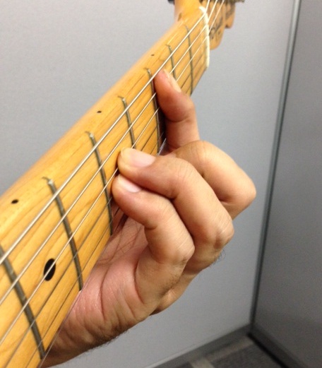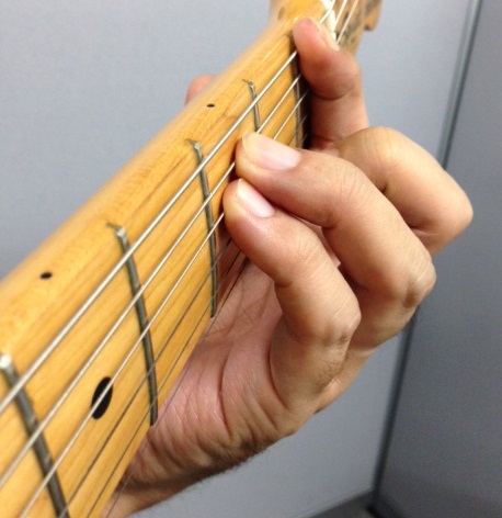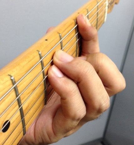 押さえていた指を力を抜いて軽く浮かせつつ、人差指で6弦に軽く触れて音が鳴らないようにしよう。