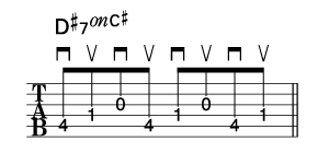 2小節目、小指はそのままに人差指で4弦1フレットを押さえる。