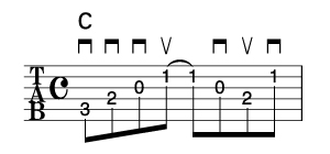 1拍目オモテ-2拍目オモテまでは、すべてダウンのエコノミーピッキングだ。