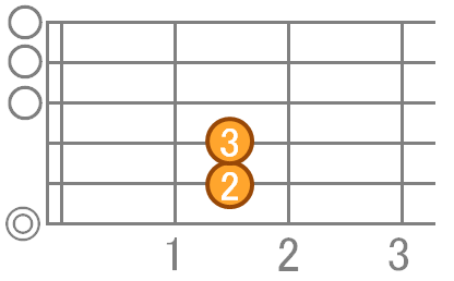 人差指で3弦1フレット、中指で5弦2フレット、薬指で4弦2フレットです。