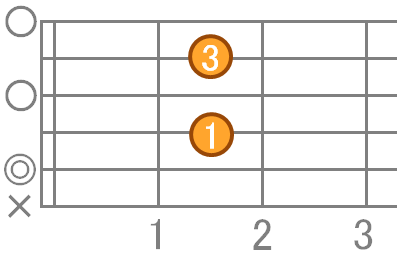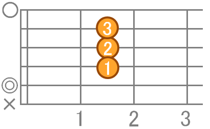 人差指で4弦2フレット、中指で3弦2フレット、薬指で2弦2フレットを押さえます。