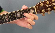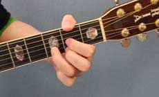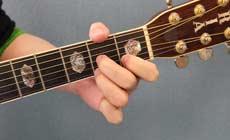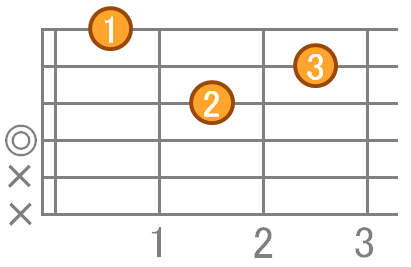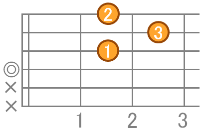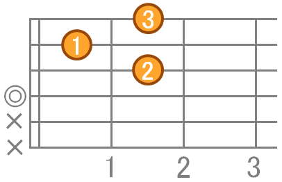 人差指で3弦2フレット、中指で1弦2フレット、薬指で2弦3フレットを押さえます。