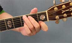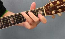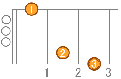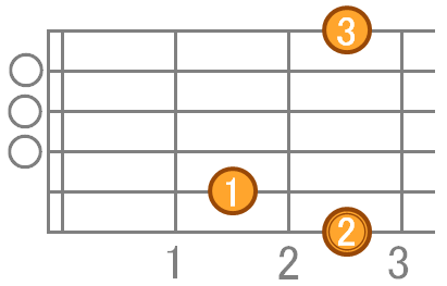 より簡単な指使いは、人差指で5弦2フレット、中指で6弦3フレット、薬指または小指で1弦3フレット。