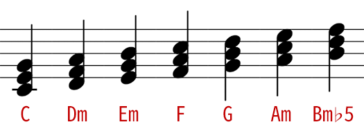 メジャースケールのそれぞれの音をルートにし、3度と5度を重ねたコードの集まりでしたね。