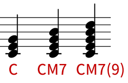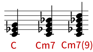 9thの音の重ね方は、今までと同様にルート、3度、5度、7度、9度です。