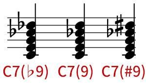 さて、前回#11thや、♭13thが出てきましたが、9thもセブンスコードの時に#と♭の両方に変化します。
